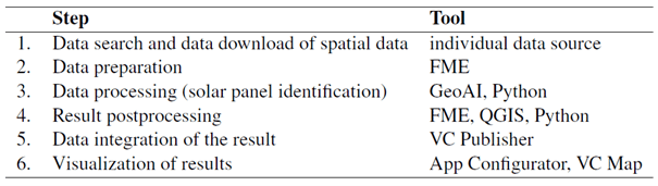 The project’s goal was to develop a workflow to identify installed solar systems in urban areas using orthophotos. Since comprehensive public datasets of installed solar systems do not exist in Germany, municipalities lack a robust foundation for analyses and planning. This workflow aims to help fill that gap and could in future serve as a data layer in VC Map.