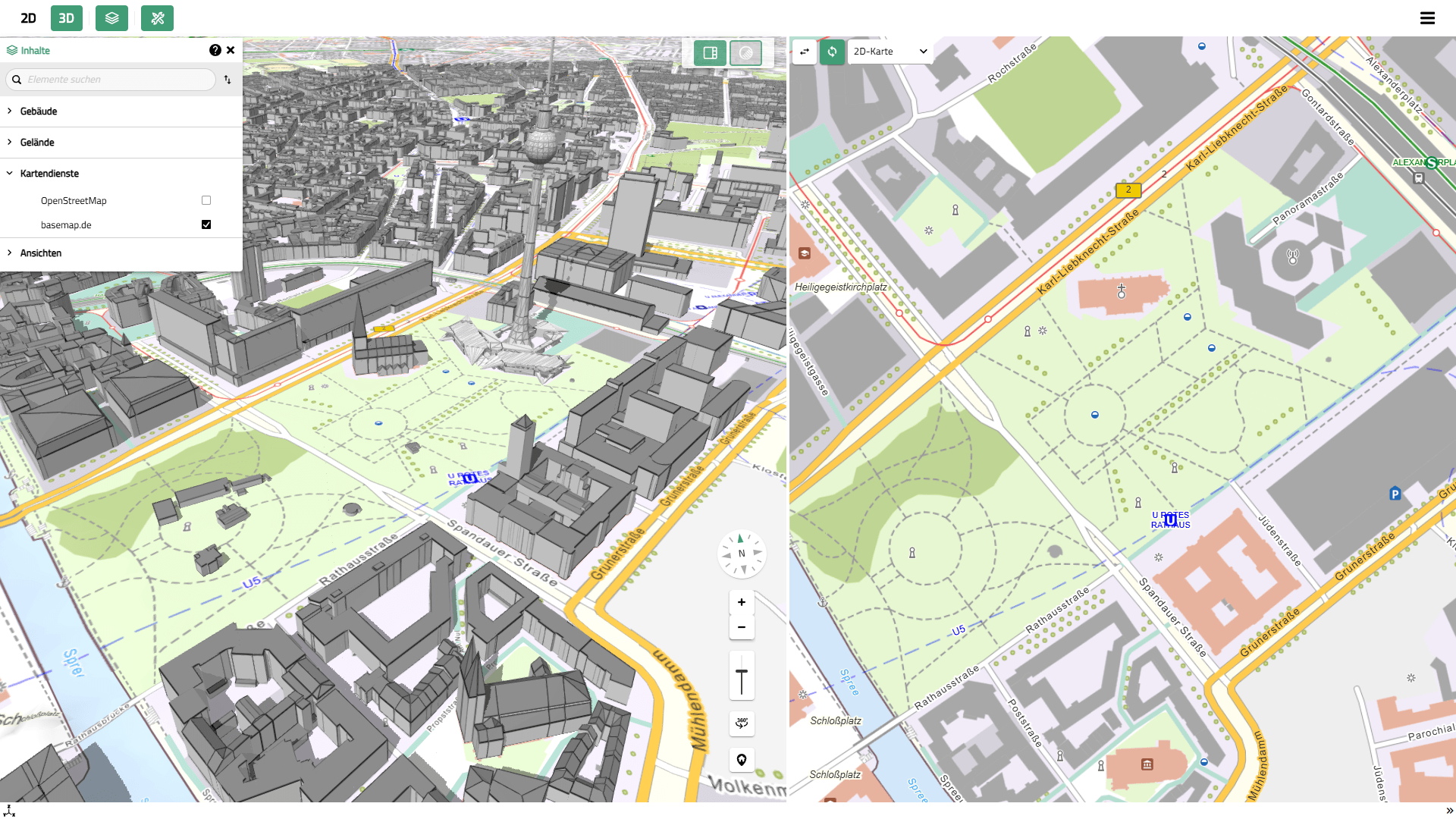 - Overlaying 3D objects, point clouds, and 3D layers (e.g., CityGML, 3D meshes (screen 2)