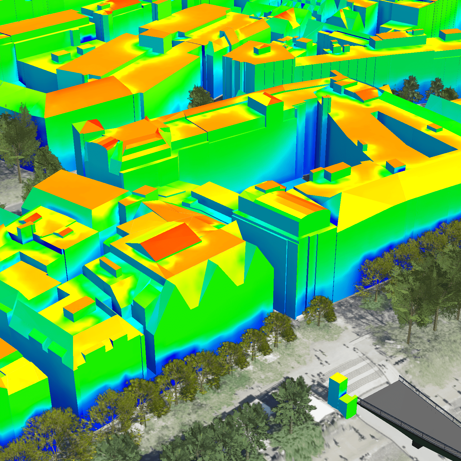 Herkömmliche Solarkataster berechnen die Sonneneinstrahlung für Dächer in der Regel in 2.5D auf Basis eines Oberflächenmodells. Das Potenzial von Fassadenflächen und die Analyse von geplanten Bebauungen wird durch die herkömmlichen Kataster nicht abgebildet.