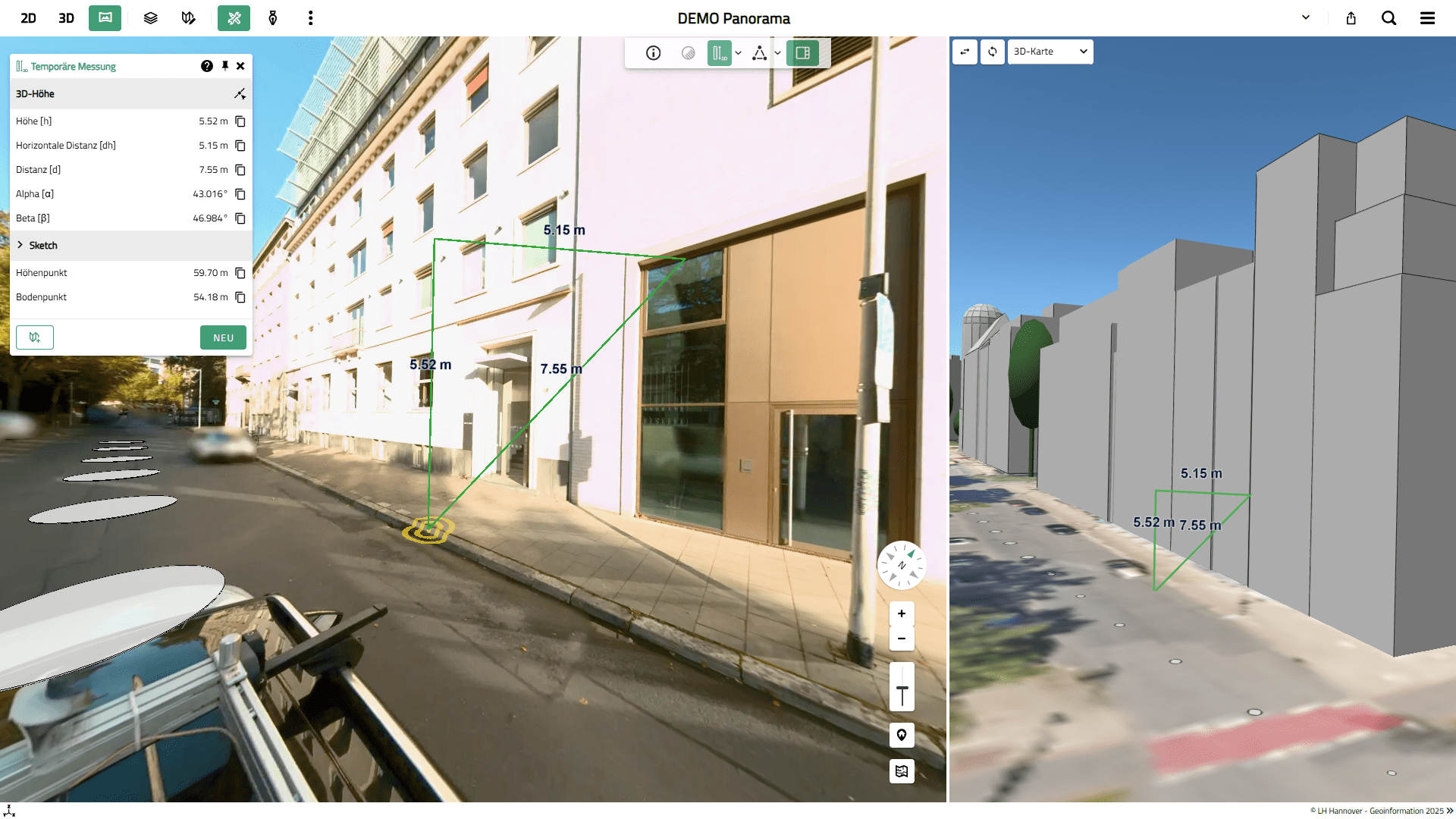 - Präzises Messen von Distanzen, Höhen und Objekten direkt im Panoramabild auf Basis von 3D-Koordinaten (Screen 1)
